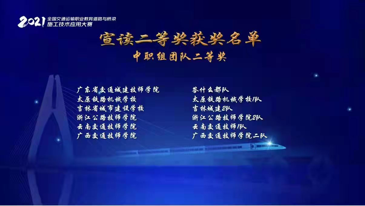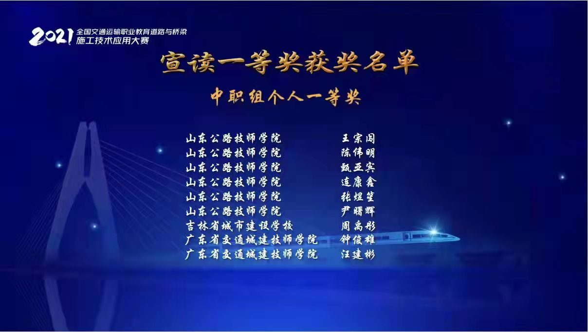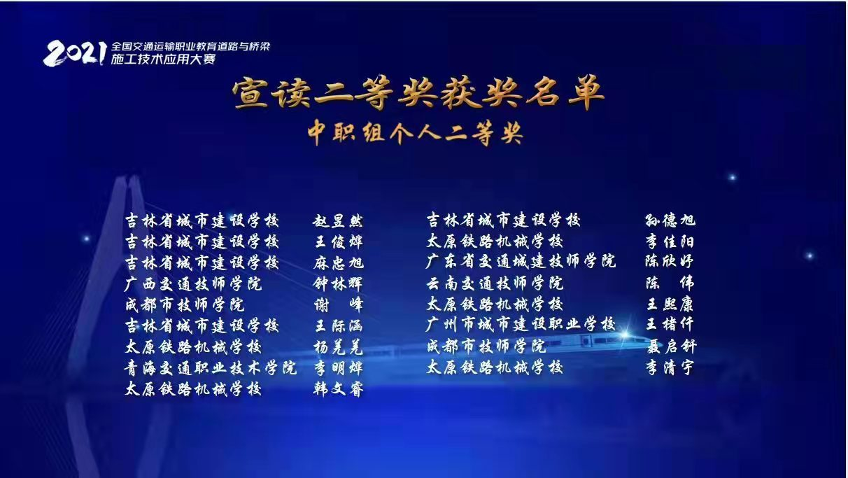 11月28日,2021年全国交通运输职业教育道路与桥梁施工技术应用技能大赛总决赛圆满落幕。吉林省城市建设学校参赛选手在比赛中摘金夺银,分获团体及个人一、二等奖,是东北三省唯一获奖学校。