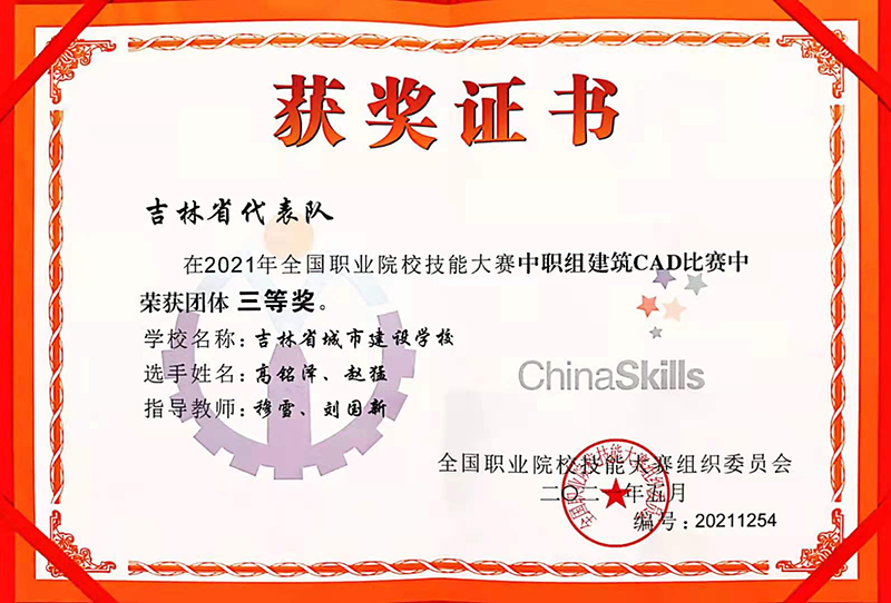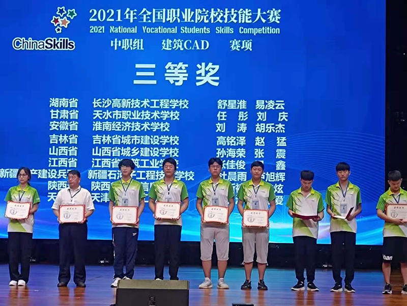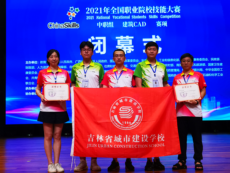 2021年全国职业院校技能大赛中职组“建筑CAD”赛项于6月19日-20日在南宁举行。吉林省城市建设学校由穆雪、刘国新老师指导的高铭泽、赵猛两位同学喜获三等奖。
