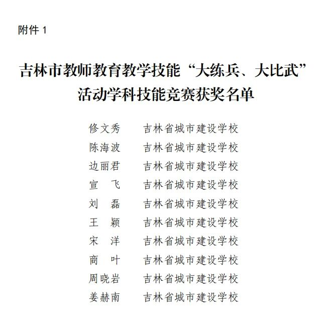 在近年吉林市教育局组织的教师教育教学“大练兵、大比武”教学技能竞赛中,学校1名教师荣获特殊贡献教师称号,3名教师荣获五星级教师称号,4名教师荣获四星级教师称号,14名教师荣获三星级教师称号。在2020年吉林市教师教育教学技能“大练兵、大比武”活动学科技能竞赛中,有10名教师再次获得殊荣;2名教师荣获吉林市名优教师示范引领“优质课”;1名教师在吉林市班主任专业技能竞赛中获奖。